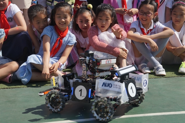 这是由中国煤炭科技博物馆联合中国矿业大学创新训练基地开展的馆校共建“科普进校园”系列活动第一站:“机器人活动走入小学校园”。此次走进校园的是取得“全国Robomasters机器人大赛东部赛区”第一名的中国矿业大学战队,志愿者们向孩子们介绍了高科技、全新机器人、人工智能元素,并展示机器人作战技术。在大学生志愿者指引下,孩子们兴高采烈地观看机器比赛,极大地激发了孩子们对现代科技的浓厚兴趣。在讲解示范过程中,小朋友们积极参与互动,主观能动性得到充分发挥。孩子们接触到了平时不能接触的东西,在给孩子们带去乐趣的同时,也让孩子们感受到了科技的无穷魅力。