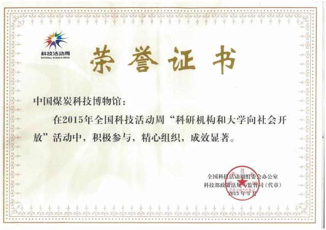 日前,中国煤炭科技博物馆在2015年全国科技活动周“科研结构和大学向社会开放”活动中,荣获全国科技活动周组委颁发的荣誉证书。