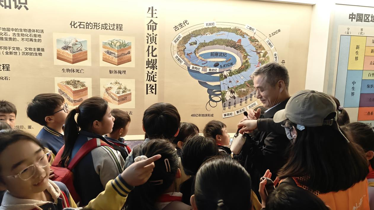 在自然陈列馆内,郭英海教授以馆内丰富的化石标本为“活教材”,用通俗生动的语言,为在场小学生系统梳理地球生命从远古到现代的演化脉络。他结合三叶虫化石、恐龙蛋化石等实物,详细讲解化石的形成原理与科学研究价值,让孩子们直观感受生命历史的壮阔与自然演化的神奇。