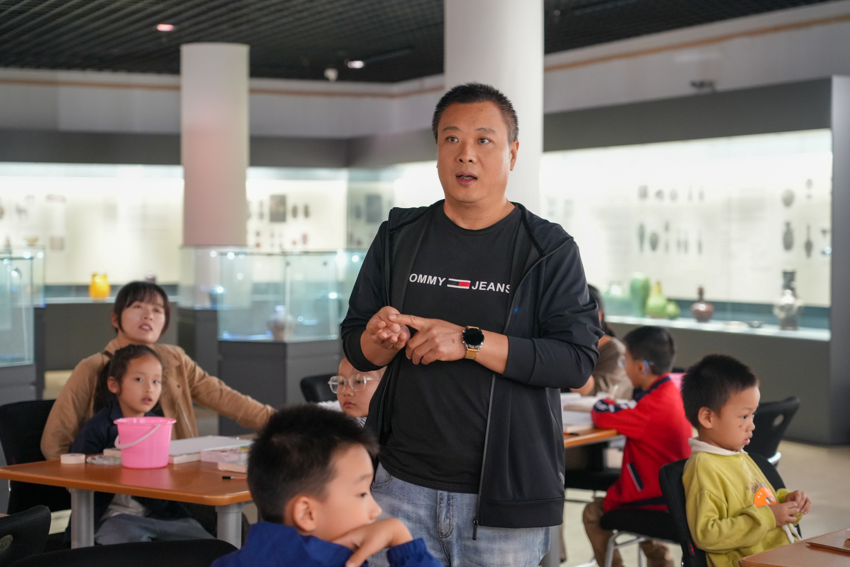 活动中,指导老师陈真以《周礼·考工记》“杂五色”记载为引,系统讲解“青、赤、白、黑、黄”传统五色体系,并结合朱砂、石青等矿物颜料标本,阐释“青出于蓝而青于蓝”的色彩渊源。参观“国色密码”特展时,孩子们发现故宫红墙的朱砂、敦煌壁画的石青均源自矿物,老师进一步引导其观察生活实例,比如朱红对联、青花瓷纹样,感知五行智慧在日常中的延续。随后,在中国矿业大学美术专业副教授张红江指导下,亲子家庭共同执笔创作,亲身体验传统色彩的独特魅力。